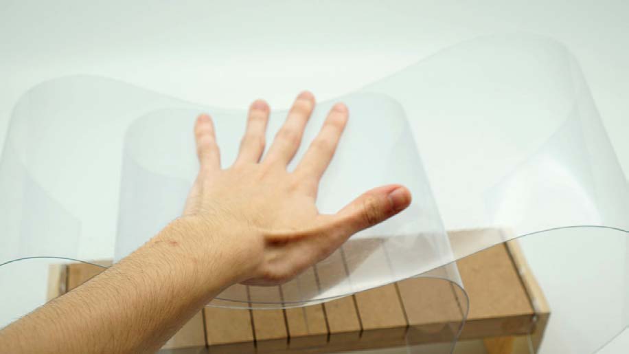 We eventually decided to use 2mm-thick vinyl sheets. At a certain length, the material develops a soft, bouncy quality while still retaining a degree of stiffness.